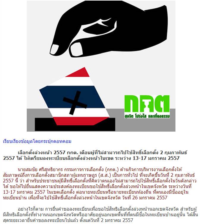 (ถ้าวันที่ 2 กุมภา ท่านไม่ว่าง ) อย่าลืมลงทะเบียนขอใช้สิทธิเลือกตั้งล่วงหน้าในเขตเลือกตั้ง วันที่ 13-17 มกราคม 2557