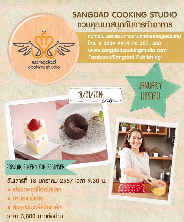 มาแล้วๆ กับคลาสสอนทำอาหารแสนอร่อยจาก Sangdad Cooking School ขอประเดิมคลาสแรกของปี 2014 ด้วยคลาสของเชฟเน็ตที่มาพร้อมกับเมนู Popular bakery for beginner ของหวานสุดฮิตสำหรับผู้เริ่มต้น ใครทำเบเกอรี่ไม่เป็นไม่ต้องกลัว ขอแค่มีใจรัก ทำได้แน่นอน เพราะเชฟเน็ตจะมาสอนขั้นตอนการทำแบบ Step-by-step กันเลย ที่สำคัญทุกสูตรผ่านการพิสูตรแล้วว่าอร่อยแน่นอน!! ส่วนใครที่ทำเบเกอรี่เป็นอยู่แล้วอยากจะลงทะเบียนเรียนก็ไม่ว่ากัน (☆^ー^☆)(☆^O^☆)