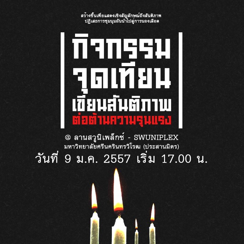 "มศว + ชาวอโศก" นัดจุดเทียน ปฏิเสธการชุนนุมที่นำไปสู่ความรุนแรง วันพฤหัสที่ 9 มค 17:00 ณ มศว (อโศก)