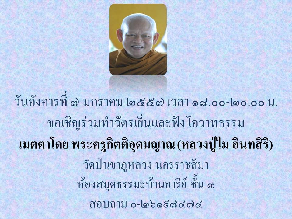 ขอเชิญร่วมนมัสการและรับฟังพระธรรมเทศนา หลวงปู่ไม อินทสิริ วัดป่าเขาภูหลวง อ.วังน้ำเขียว จ.นครราชสีมา วันพุธที่ 11 กันยายน พ.ศ.2556 เวลา 15.00-18.00 น. ณ กลุ่มพุทธธรรมกรรมฐาน มหาวิทยาลัยรามคำแหง อาคาร