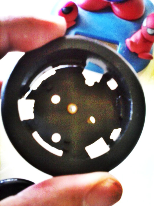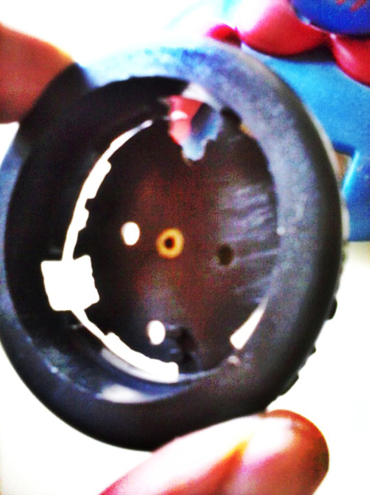 อะไหล่รถยนต์ฝาปิดช่องโคมไฟท้ายที่กระโปรงหลัง วัสดุเป็นพลาสติกสีดำยืดหยุ่นได้นิดหน่อย เกิดหักตอนงัดเปิดฝาออกมา และมีพื้นที่บางส่วนที่แตกหายไป เป็นชิ้นเล็กๆ ไม่เกิน 3 ตร.มม. นอกจากติดกาวให้ติดกันเ