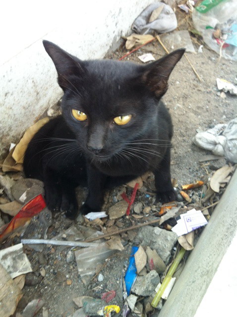 และภาพที่ได้เห็นก็คือ ลูกแมว อายุน่าจะประมาณ 4-5 เดือน (เพราะเทียบขนาดตัวและเขี้ยว เท่ากับเจ้าเด็กๆ ที่บ้าน ) สีดำมืด ตาเหลืองเป็นประกายแห่งความหวัง ปนแก้วตาของการขอความช่วยเหลือ เจ้าเหมี๊ยวโดนเอามาวางไว้ ( หรือว่าคลานมาหลบตรงซอกปูนที่แตกใต้ตอหม้อสะพานลอย ) นั่งอยู่ตรงซอก ร้องเรียก ตลอดเวลา