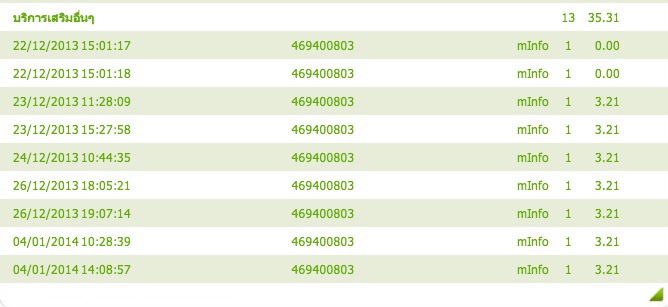 เราเติมเงินไป 50 บาทเมื่อสายๆของวันที่ 4 มกราคม ตอนนั้นถ้าจำไม่ผิดเราเหลือเงินไม่ถึง 5 บาทแล้ว เบอร์นี้เราโทรออกน้อยมาก โทรแต่ละทีก็สั้น ไม่ค่อยเกิน 3 นาทีแทบทั้งนั้น จากวันที่เติมเงินไปเราไม่ได้โทรหาใครเลย มีแต่คนโทรเข้าทั้งนั้น แล้วเราก็เริ่มสังเกตว่ามี sms มาเป็นแนวซุบซิบดารา ก็ไม่ได้สนใจ คิดว่าเป็นโฆษณาเลยลบทิ้งตลอด จนเมื่อกี้มี sms เข้ามาอีก เลยชักเอะใจว่าทำไมส่งมาเยอะนัก เลยกดไปเช็คเงินดู ปรากฎเหลือเงินแค่ 27.77 บาท ทั้งๆที่เราไม่เคยสมัครรับข่าวไร้สาระนี่เลย ลองเข้า eservice ไปตรวจสอบดูพบว่าเป็นบริการ mInfo มันเริ่มส่งมาตั้งแต่วันที่ 22 ธันวาคมปีก่อน ตามในภาพนี่เลย เราแคปมาจากในเวบค่ะ