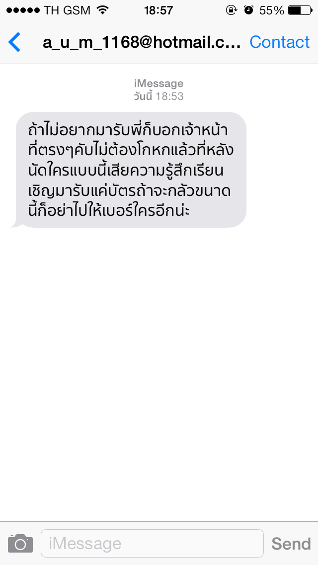 จากนั้นเวลาประมาณเกือบ 1 ทุ่ม ก็มีข้อความส่งมาจากอีเมลล์ a_u_m_1168@hotmail.com ส่งมาต่อว่าผมตามภาพเลยครับ ผมหน้าเปลี่ยนสีทันที ยอมรับเลยว่าโกรธ และโมโหจัด ผมยังไม่ทันจะโทรไปนัดหมาย ก็มีข้อความส่งมาต่อว่า ทำไงหล่ะ ก็โกรธสิครับคุณ ไม่คิดเลยว่า Fitness ที่มีชื่อเสียงขนาดนี้ ให้บริการลูกค้าอย่างนี้เหรอ เค้าพูดจากลับลูกค้าแบบนี้เหรอ ผมทำผิดอะไร เวลาเราก็ไม่ได้นัดหมายกัน แค่บอกว่าจะโทรกลับช่วงเย็น คำถามคือ เค้ารอไม่ได้ใช่มั้ย เร่งปิดการขายใช่มั้ย