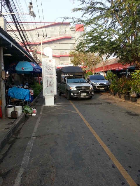 ต้องหักหลบหมด มันอยู่กลางถนนเลย ถ้าถรรว่าง ๆ ปกติ จะเหมือนอยู่ริมถนน แต่ถ้าวันพุธ พฤหัสที่ขายต้นไม้ จะมีร้านต้นไม้อยู้เต็มทางซ้ายมือ ดังนั้น ป้ายนี้ จะเหมือนขวางกลางถนนเลย ไม่รู้คิดได้ไง