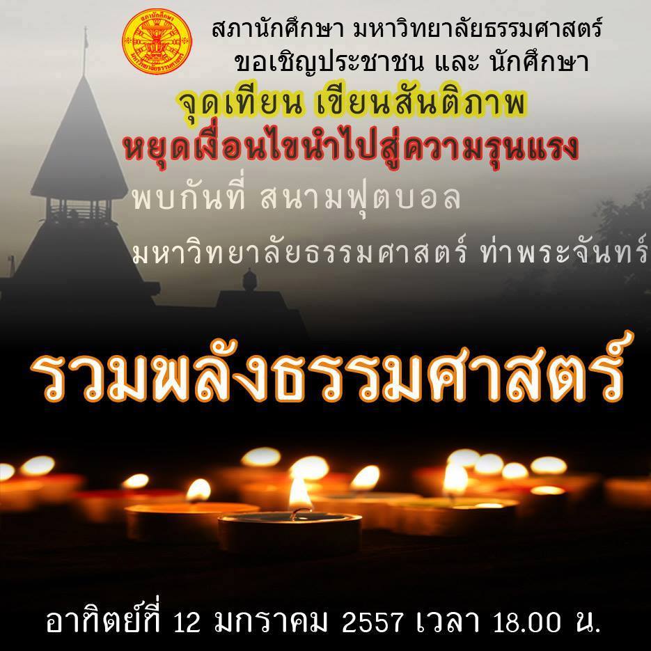 .....สภานักศึกษาธรรมศาสตร์ ขอเชิญชวนร่วม "จุดเทียน เขียนสันติภาพ หยุดเงื่อนไขไปสู่ความรุนแรง".....