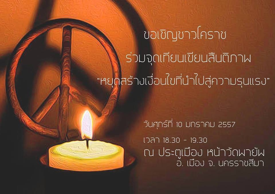 โคราชจุดเทียนวันนี้ เอาหัวใจไปด้วย ผมเองขอเปิดเผยเล็กน้อยว่าเคยเป็นผู้นำเสื้อเหลืองมาก่อน แต่เมื่อพบความสกปรกในหมู่ผู้นำเสื้อเหลืองด้วยกันก็ถอยออกมา ให้เพื่อนๆยำประเทศให้เละอย่างอิสระ ผมขวางเขาไม่อยู่ วันนี้ 10 มกราคม 2557 ตอนเย็นไปเจอกันครับ ใส่เสื้อขาวไปก็ดีครับ ไม่ก้าวร้าว ไม่โหวกเหวก ไม่หยาบคาย ไม่จาบจ้วงใครครับ เป็นตัวอย่างของสุภาพชนที่ทนการกดขี่คดโกงไม่ได้ อดทน อดกลั้น อัดอั้นก็ไปร่วมกันนะครับ