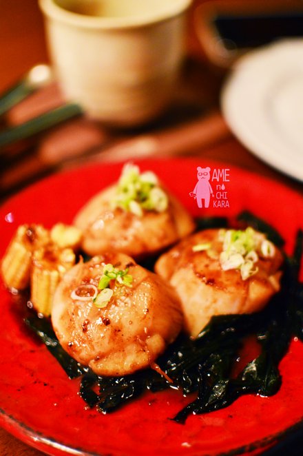 หอยเซลล์จี่กระทะมาพร้อมสาหร่ายวากาเมะผัดเนย เพิ่งจะเคยกินสาหร่ายวากาเมะผัดเนยนี่แหละ รสชาติไม่ได้ประหลาดเท่าที่คิดไว้ ตัวหอยเชลล์ตัวโต สุกแต่ข้างนอก ตรงกลางดิบหน่อยๆ เนื้อหวานมาก (พนักงานแจ้งว่าปกติมี2ชิ้น พอดีพวกผมไปกัน3คนเลยเพิ่มเงินแล้วขอให้ทำเป็น 3ชิ้นมาให้)