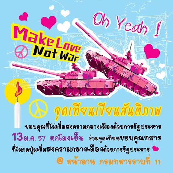 กิจกรรมมอบดอกไม้ให้รถถัง ขอบคุณที่ไม่รัฐประหาร ที่กองทัพไทย (เช้า) และหอศิลป์ กทม. (บ่าย) https://www.facebook.com/events/1412287302342672/ ล่องเรือไฟจุดเทียนกลางแม่น้ำเจ้าพระยา โดยเพจ ลูกพระจอม