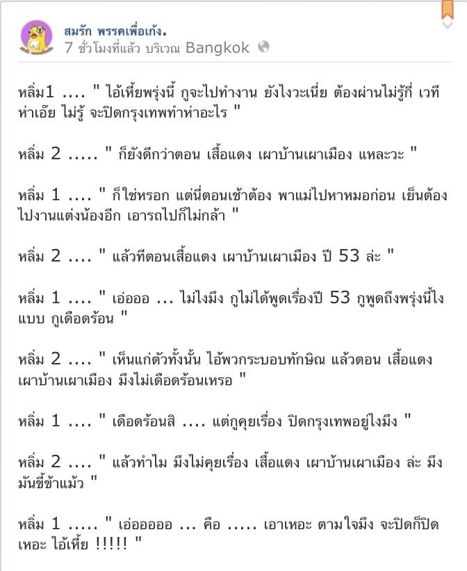 ฝากถามสลิ่ม สลิ่มบอกว่า บ้านเมืองสงบ นายกจะต้องลาออกจากรักษาการ แต่คุณเคยไหมว่า ถ้าสุเทพไม่ไปตั้งชุมนุมม็อบเหตุการณ์ตั้งแต่วันนั้นถึงวันนี้ก้อไม่มีแล้ว จริงไหม สลิ่ม แล้วอย่าดิ้นละ สมงสมองหายไปไหนหมดแ