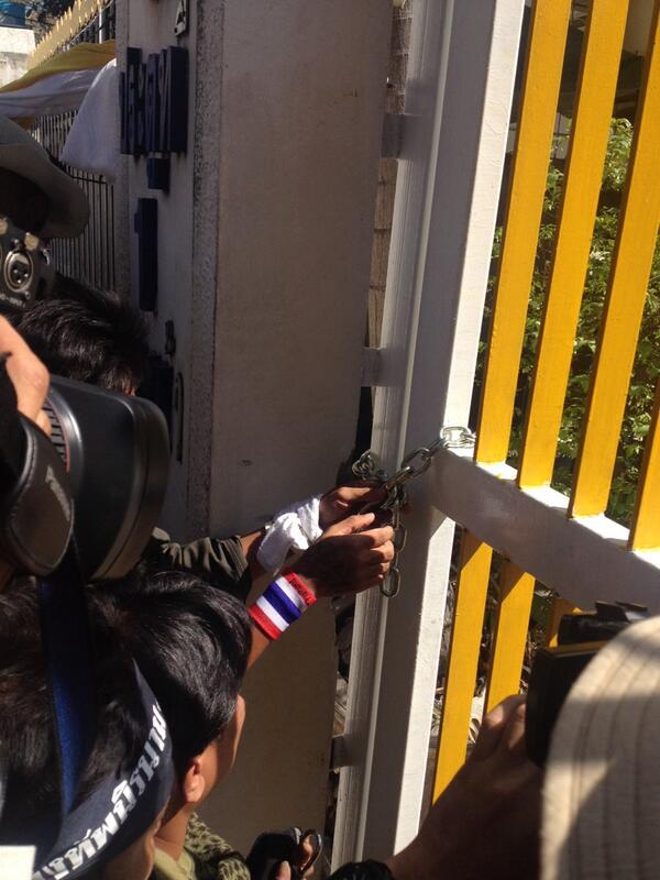 กปปส.คล้องกุญแจปิดประตู1ก.แรงงานขณะขีดเส้นให้ ขรก.ออกมาร่วมชุมนุมภายใน11.50น.