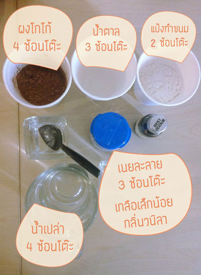 - ผงโกโก้          4 ช้อนโต๊ะ (ตอนแรกใช้โอวันตินลองดูค่ะแต่ไม่รอด)