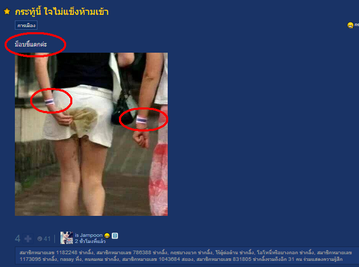 ม๊อบสาวขี้แตรกกก สงสารเขา ผู้แว่ กทม หาส้วมเพิ่มด่วนค๊าฟฟ http://pantip.com/topic/31510855 ภาพเก่าไม่เกี่ยวกับชุมนุมเลย แถมเพิ่มสายรัดข้อมือ อ้างอิง http://amazingstoriesaroundtheworld.blogspot.