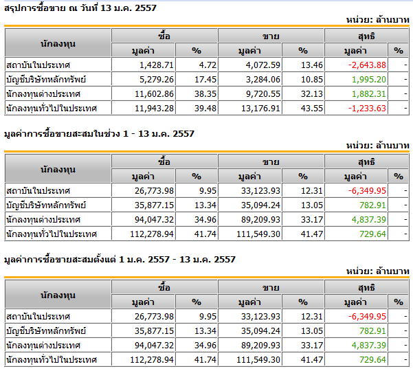 เว็บไซต์ตลาดหลักทรัพย์แห่งประเทศไทย รายงานสรุปการซื้อขายหลักทรัพย์ โดยแบ่ง ตามประเภทนักลงทุน ประจำวันที่ 27 กุมภาพันธ์ 2557 ดังนี้ กลุ่ม ปริมาณซื้อ % ปริมาณขาย % สุทธิ (ลบ.) (ลบ.) (ลบ.) นักลงทุนสถาบั