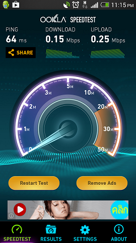 แต่เมื่อหลายวันก่อนหลังจากผมใช้ครบ 1.5 GB พบว่าหน้าเน็ตโหลดช้ามาก ซึ่งเป็นไปไม่ได้ว่าความเร็ว 384 Kbps มันจะช้าได้ขนาดนี้ ผมจึงลองเทสสปีดก็ได้แค่ 0.12 - 0.15 Mbps หรือ 128 Kbps