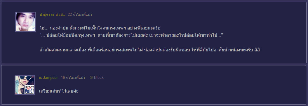 จับแกนนำได้สักตัวจากสิบเก้าตัว ตัวอื่นๆ จะได้ หนาว แต่ถ้าจะจับลุงกำนันผมนะครับ แนะนำให้ เอาเชือกลายธงชาติไปด้วย จับแล้ว ถ่ายทอดสดเลย กำนัน บอกแพ้แล้วจะฆ่าตัวตาย ถามลุงกำนันผมออกทีวีเลยนะครับ ลุง