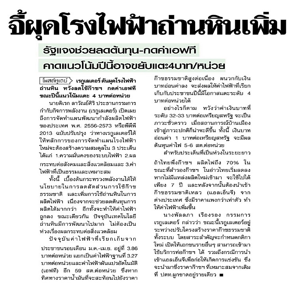 จี้ผุดโรงไฟฟ้าถ่านหินเพิ่ม รัฐแจงช่วยลดต้นทุน-กดค่าเอฟที คาดแนวโน้มปีนี้อาจขยับแตะ4บาท/หน่วย