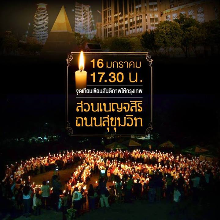 กลุ่มนักกิจกรรมจุดเทียน ขอเชิญผู้ร่วมปกป้องประชาธิปไตย จุดเทียนร่วมกัน ณ สวนเบญจสิริ ถ.สุขุมวิท 16 มกราคมนี้ ตั้งแต่เวลา 17:30 น. เป็นต้นไป