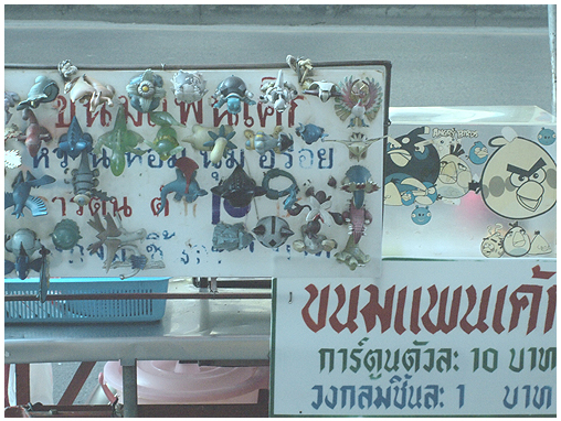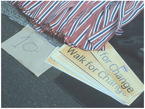 พอปั่นข้ามถนนมา ตามทางเท้าจะมีสินค้าที่เกี่ยวกับการชุมนุมวางขายอยู่ประปราย