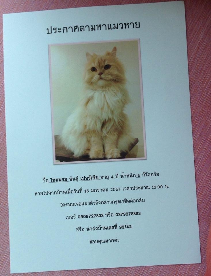 🙏ช่วยแชร์หน่อยค่ะ... แมวเปอร์เซียของหลานสาวหายไปตั้งแต่วันที่ 15 ม.ค.57 จนตอนนี้ยังหาไม่เจอเลยค่ะ...🐈 ขอร้องเถอะค่ะ...หลานสาวร้องไห้ทุกวันตั้งแต่หายไปล่ะค่ะ...🙏 FB : Ratchanee Nance ปล. ขอฝากห้องแ