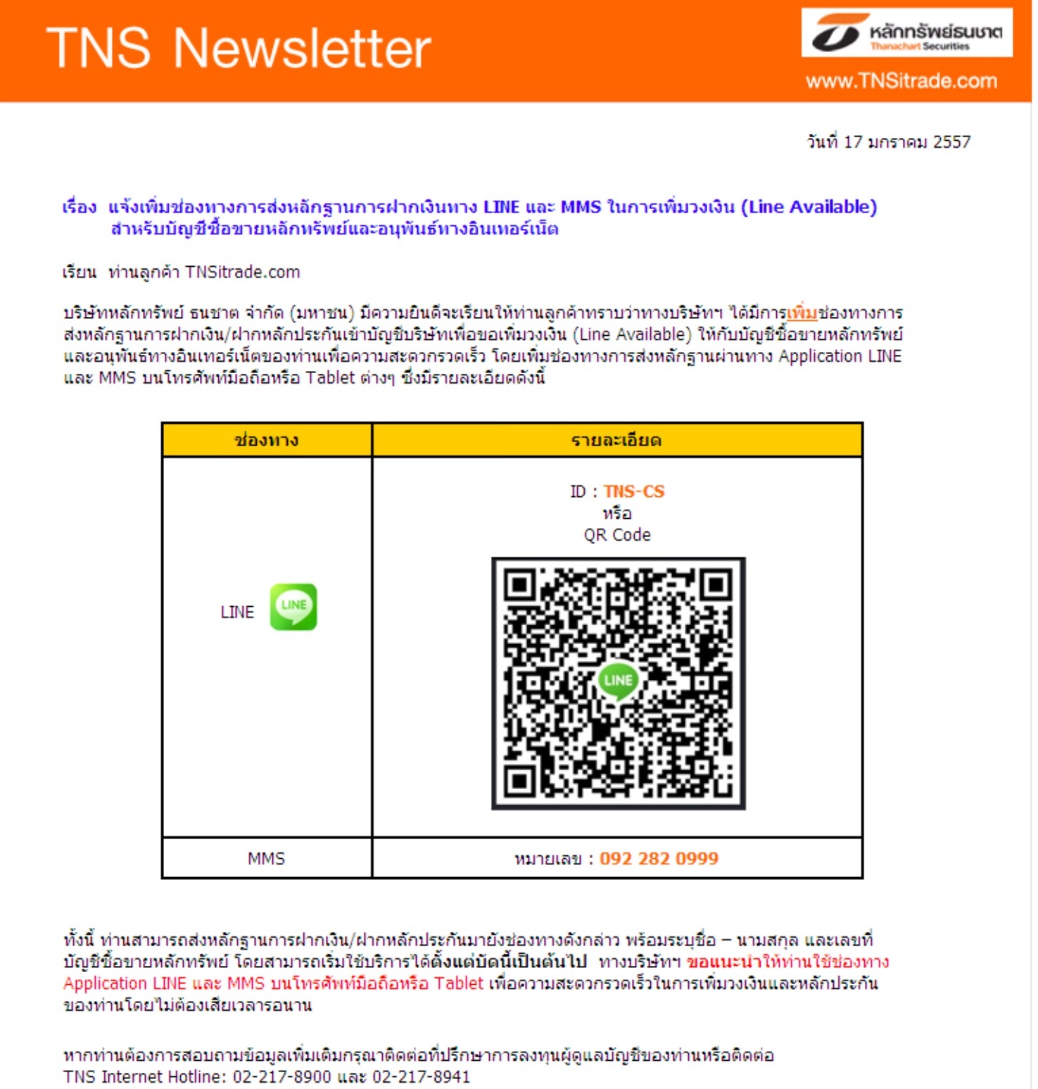 บล.ธนชาต: แจ้งเพิ่มช่องทางการส่งหลักฐานการฝากเงินทาง LINE และ MMS ในการเพิ่มวงเงิน (Line Available)