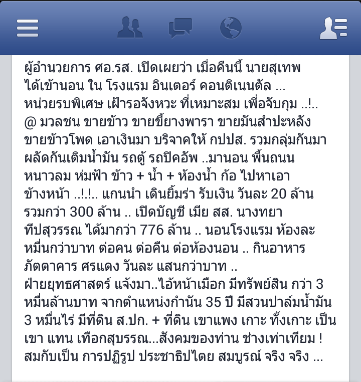 ถ้านายสุเทพตั้งได้ ต่อไปใครไม่ถูกใจก็รวมตัวกันตั้งมันขึ้นมาใหม่ รับรองได้เลยถ้านายสุเทพชนะ ก็จะมีแบบนี้ตามมาอีกไม่รู้จักจบสิ้น นายสุเทพคิดว่าประเทศนี้เป็นของมันคนเดียวหรืออย่างไร สงสารในหลวงจังเลย ขอพ