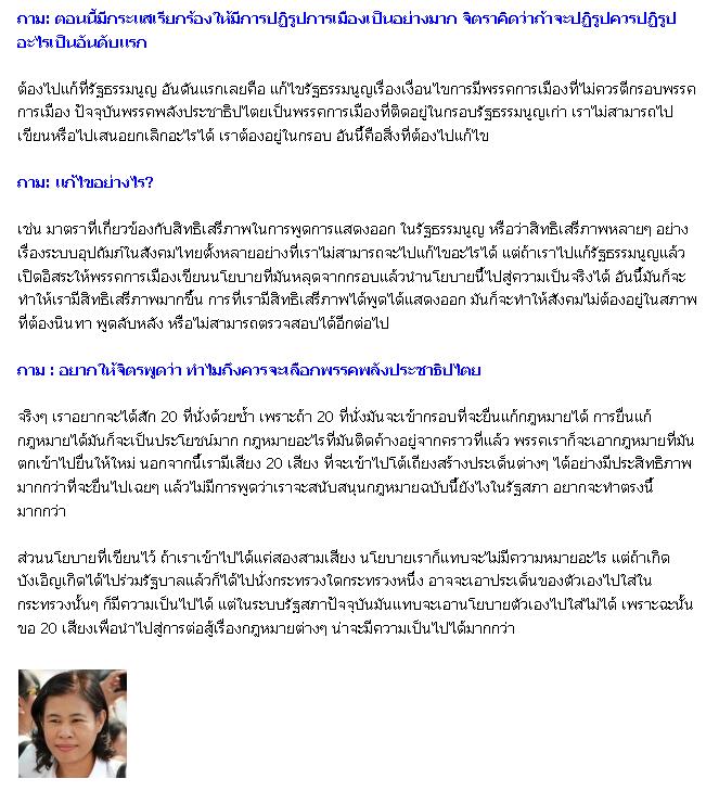 https://www.youtube.com/watch?v=MrYIWr4qoDg สำรวจความคิดเห็นคนชนบทที่ทำงานในกรุงเทพฯ ช่วงก่อนศาลรัฐธรรมนูญจะมีคำวินิจฉัยเรื่องเลื่อนเลือกตั้ง คุยทั้งอาชีพ กรรมกร ขายของ แม่บ้าน ถึงประเด็นแห่งยุค