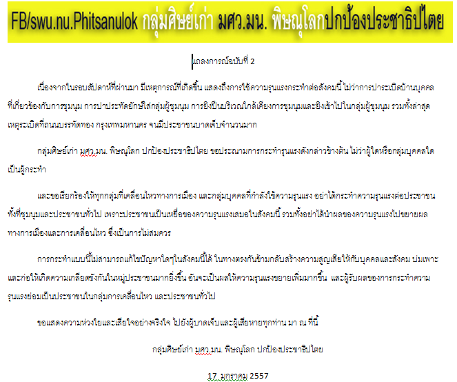 กลุ่มศิษย์เก่า มศว.มน. พิษณุโลก ปกป้องประชาธิปไตย ขอประณามการกระทำรุนแรงดังกล่าวข้างต้น ไม่ว่าผู้ใดหรือกลุ่มบุคคลใดเป็นผู้กระทำ
