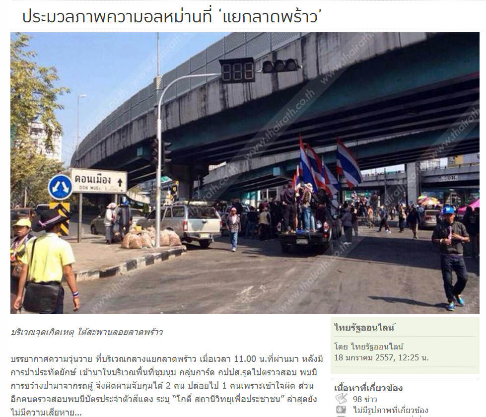 การ์ด กปปส.รวบ 3 คนร้าย ปาประทัดยักษ์ลงจากรถตู้บนสะพานข้ามห้าแยกลาดพร้าวใส่ผู้ชุมนุม พบหนึ่งในนั้นมีบัตรประจำตัวทีมงานของ“โกตี๋” เสื้อแดงจอมกร่างแห่งปทุมธานี การชุมนุมของกลุ่มประชาชนเพื