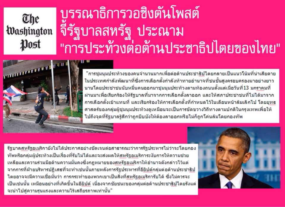 วอชิงตันโพสต์เรียกร้องรัฐบาลสหรัฐ ประณามกลุ่มปฏิปักษ์ประชาธิปไตยในไทยขั้นรุนแรง ชี้รัฐบาลยิ่งลักษณ์ต้องการแรงสนับสนุนจากอเมริกา ต้านระบอบปกครองโดยเสียงข้างน้อย บทบรรณาธิการหนังสือพิมพ์วอชิงตันโพสต์