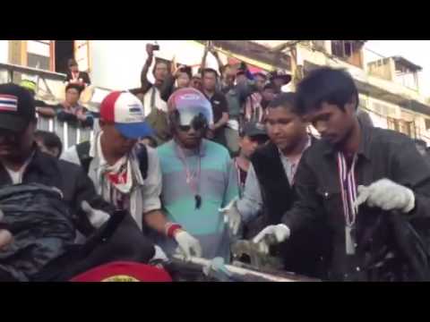 หลังเกิดระเบิดที่บันทัดทอง การ์ดของกปปส. เข้าตรวจค้นและนำของที่ตรวจพบและคิดว่าเป็นอาวุธพร้อมชุดสีแดงออกมาจากถุง..ช่วยกันคนละไม้คนละมือนำของออกมาแสดงแถลงข่าว ..ใส่ถุงมืดด้วยนะครับ เก่งจุงเบยยยยยยยยย