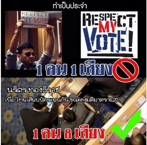 คนเรามันก็คิดได้แค่เนี่ยแหละว่าให้ Respect My Vote แต่พอ Vote เสร็จ ไอ้คนที่ถูก Vote ให้เนี่ย มันเคย Respect Your Vote บ้างเปล่าหว่า ไอ้คนที่ Vote แล้วบอกว่าให้ Respect My Vote ก็ได้แต่แบะ ๆ ทำอะไรไม่