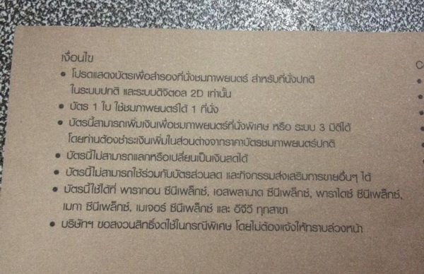 - ใช้ได้ที่ พารากอนซีนีเพล็ก / เมเจอร์ อีจีวี ทุกสาขา / พาราไดซ์ ซีนีเพล็ก / เมกา ซีนีเพล็ก และเอสพลานาด สาขา งามวงศ์วาน แคราย และ รัชดาภิเษก