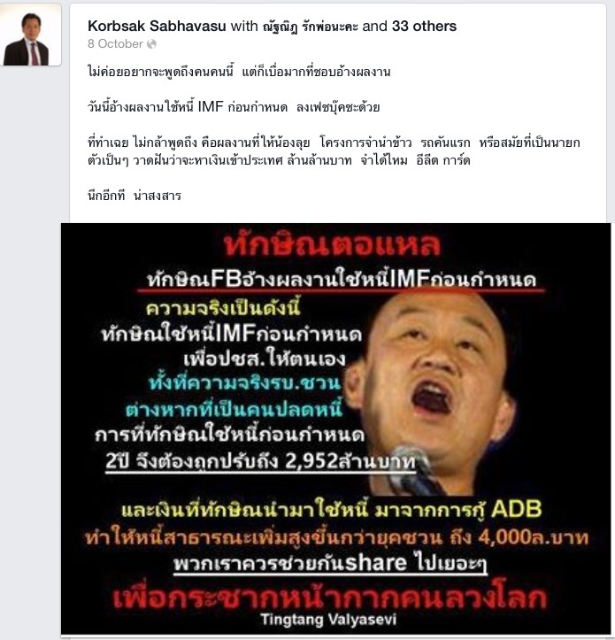 เศรษฐกิจแย่แบบนี้ ถ้าลุงแม้วอยู่จะกู้มาเพื่อใช้หนี้ IMF ค่าปรับแค่สามพันกว่าล้าน แถมหาเงินในอากาศได้เก่งไม่กู้แม้แต่น้อย