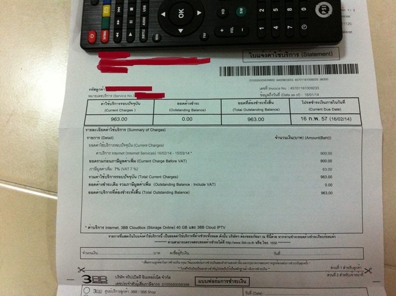 วันอังคารที่ 22-01-14 มีบิลเรียกเก็บค่าบริการมาเป็นเงิน 963.00 บาท เป็นยอดการใช้งานของวันที่ 16/02/14 - 15/03/14