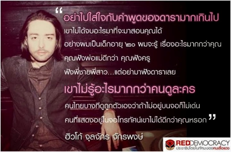 ผมไม่เห็นด้วยกับการทำรัฐประหารแน่นอนครับ ก่อนหน้านี้เราไปร่วมกับพันธมิตรฯ เพราะเราต่อต้านนโยบายที่ดูเหมือนเป็นการสะสมผลประโยชน์ของครอบครัว เรารู้สึกว่าต้องมีการสอบสวนให้มันสบายใจ เขาอาจจะบริสุทธิ์ก็ได้ แต่มันไปไม่ถึงจุดนั้นเพราะมีรัฐประหาร ถึงตอนนี้จึงไม่มีใครฟังใคร ฝั่งโน้นก็ไม่ยอมรับการตัดสินของศาล เพราะฉะนั้นผมไม่เห็นว่าทำไมเราต้องมาทะเลาะกัน ถ้าเราเอาคาแร็กเตอร์ตัวละครต่างๆ ออกไป เราทะเลาะกันเรื่องอะไรอยู่ถ้าไม่ใช่เรื่องทักษิณ ปัญหาหลักของคนพวกนี้นอกนั้นเขาอยากได้อะไร แล้วการเข้าใจเรื่องประชาธิปไตยคือการเลือกตั้ง ใช่ เลือกตั้งเป็นส่วนเล็กน้อย ภายใต้รัฐบาลที่มาจากการเลือกตั้ง คือกฎหมายที่ศักดิ์สิทธิ์ แต่ถ้าคน ๙๐ เปอร์เซ็นต์เลือกเขามาแล้วเขาทำตัวเป็นเผด็จการ หรือสื่อไม่อิสระ หรือกฎหมายไม่มีคุณค่า หรือว่ามีอะไรก็ตามเกิดขึ้นภายใต้รัฐบาลที่ไม่บริสุทธิ์ ถึงจะเลือกตั้งมาแต่มันไม่ใช่ประชาธิปไตย และนี่อาจจะเป็นประเด็นที่คนไม่ค่อยคิด ก็เลือกแล้วเลือกอีกซึ่งไม่ใช่ การเลือกตั้งอย่างเดียวมันไม่พอ