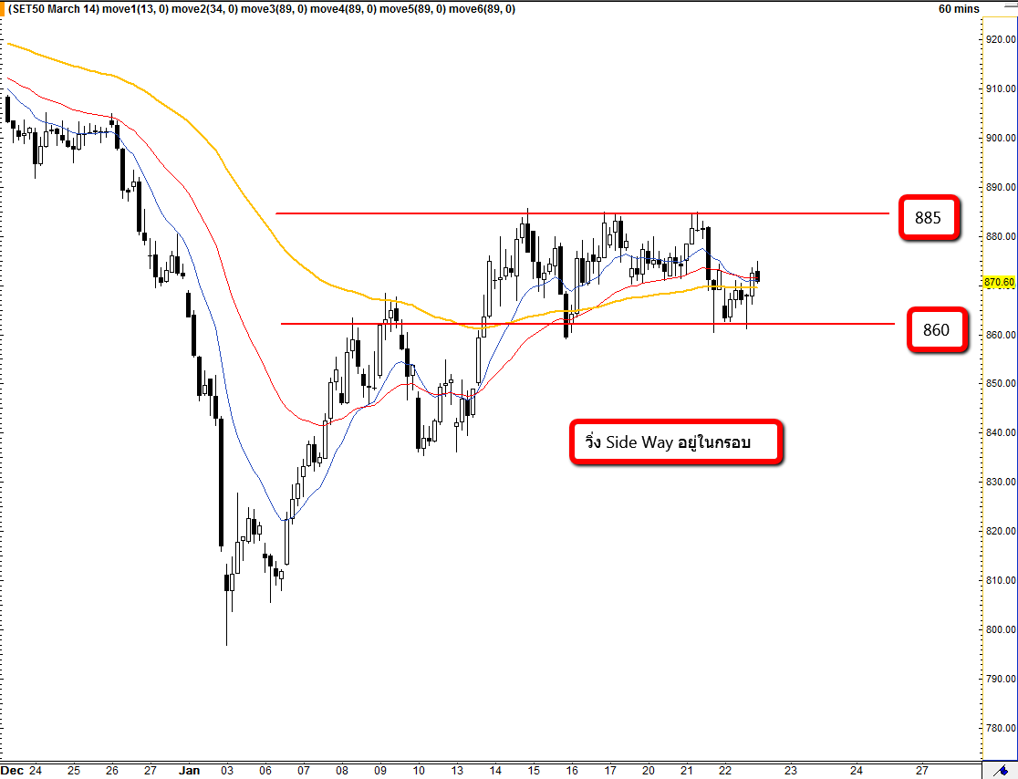 - วันนี้ S50 วิ่งอยู่ในกรอบ Side Way ระหว่าง 885 - 860 เหมือนเดิมครับแต่ในระหว่างวันมีความผันผวนพอให้เทรดได้อยู่พอสมควรมีลงมาเตะแถว 860 ให้ลุ้นอยู่เหมือนกัน ถ้าคนที่เทรด TF 60 แบบผมคงจะไม่ได้ Take Action อะไรแต่ถ้าเทรดใน TF ที่เล็กกว่าก็จะมีจังหวะให้เล่นอยู่เสมอครับกลยุทธ์ผมตอนนี้คือรอครับ