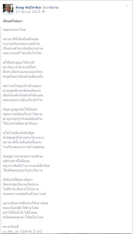 ผู้สื่อข่าวรายงานว่า เมื่อคืนวันที่ 11 มกราคม นายพิเชษฐ พันธุ์วิชาติกุล อดีต ส.ส.กระบี่ พรรคประชาธิปัตย์ (ปชป.) ได้โพสต์ข้อความผ่านเฟซบุ๊กส่วนตัว"พิเชษฐ พันธุ์วิชาติกุล"ว่า จากที่ กกต.มีมติเ