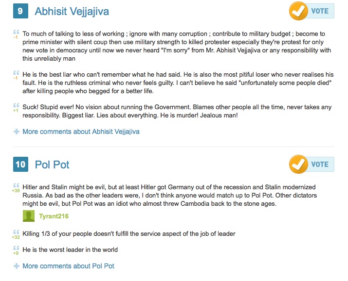 มีความพยายาม จัดตั้งให้คนเข้าไปโหวตเพื่อผลโหวต เอามาเล่นงานทักษิณกับยิ่งลักษณ์ จากลิ้งด้านล่าง ใครต้องการโหวตให้อภิสิทธิ์บ้างก็มีนะครับ http://www.thetoptens.com/worst-world-leaders/ ปล. ไม่ทราบ