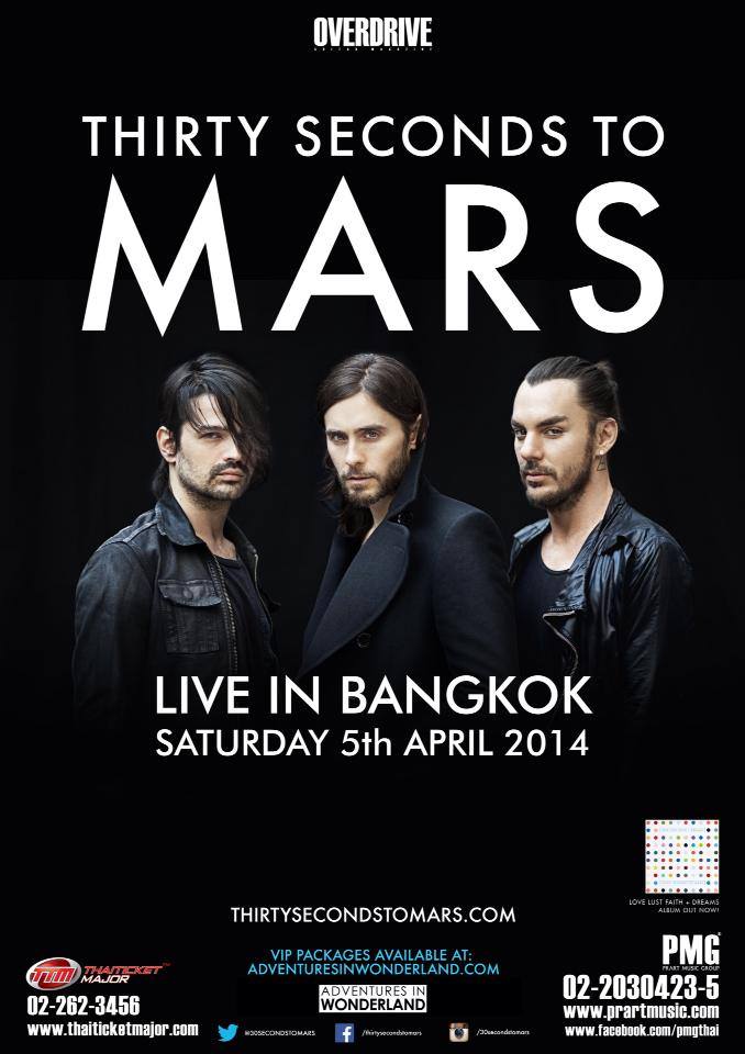 ครั้งแรกกับ "30 Seconds To Mars Live In Bangkok" คอนเสิร์ตใหญ่ครั้งสำคัญที่ไม่ควรพลาด เสาร์ ที่ 5 เมษายนนี้ ที่ไบเทค บางนา จับจองสำรองบัตรกันได้ที่ Thai Ticket Major ทุกสาขา ห้ามพลาด!!! ด้วย