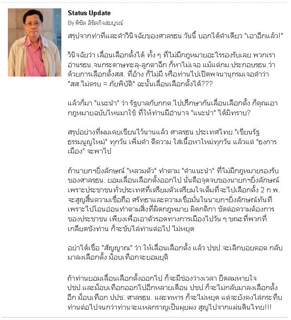 ถ้าท่านยอมเลื่อนเลือกตั้งออกไป ก็จะมีช่องว่างเวลา ยืดลมหายใจปชป.และม็อบเทือกออกไปอีกหลายเดือน ปชป.ก็จะไม่กลับมาลงเลือกตั้งอีก ม็อบเทือก ปปช. ศาลรธน. และทหาร ก็จะไม่หยุด แต่จะยังคงไล่กระทืบท่านต่อไปจนกว่าท่านจะแหลกราญเป็นผุยผง สูญไปจากแผ่นดินไทย!!!