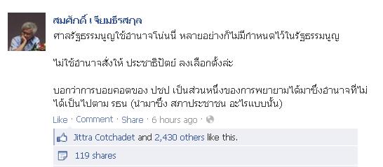 ผมคิดว่านี่เป็นโอกาสที่ดีที่เราจะให้ศาลรัฐธรรมนูญวินิจฉัยในอำนาจและหน้าที่ของตน ถ้าวินิจฉัยมาว่าเลื่อนได้มันก็ผูกพันธ์ทุกองค์กรอยู่แล้วรัฐบาลก็ไม่กล้าดึงดันอีกต่อไป จะได้ไม่ต้องไปหามาตรา 3 มาตรา 7 กัน