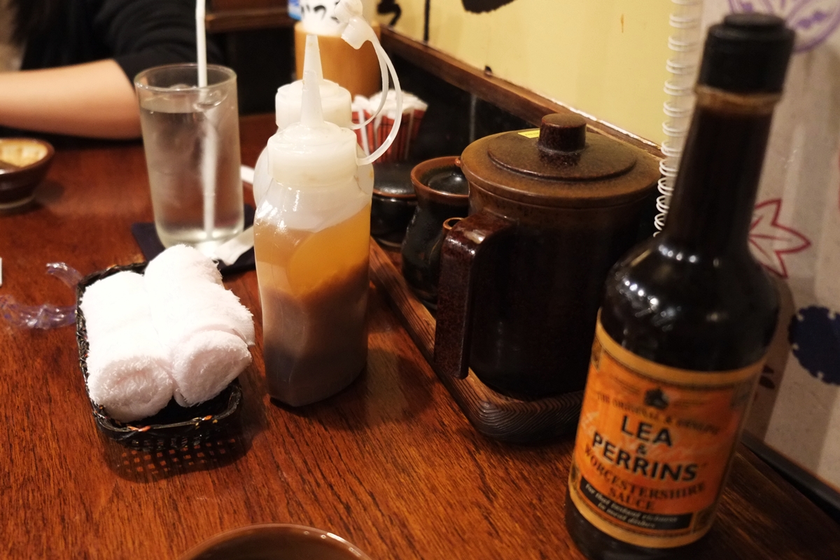 มีซอสทงคัทซึ วูสเชสเตอร์ซอส โชวยุ มัสตาร์ด และน้ำสลัดงาสองแบบครับ