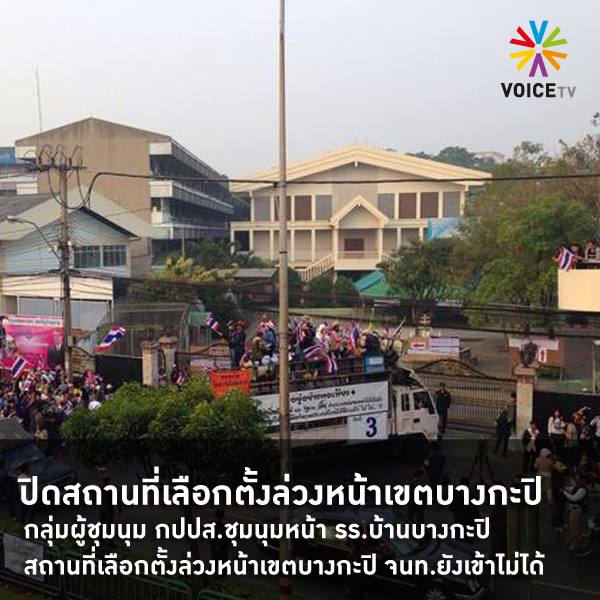 กลุ่มผู้ชุมนุม กปปส.ชุมนุมหน้ารร.บ้านบางกะปิ สถานที่เลือกตั้งล่วงหน้าเขตบางกะปิ จนท.ยังเข้าไม่ได้ via@pakapong_report