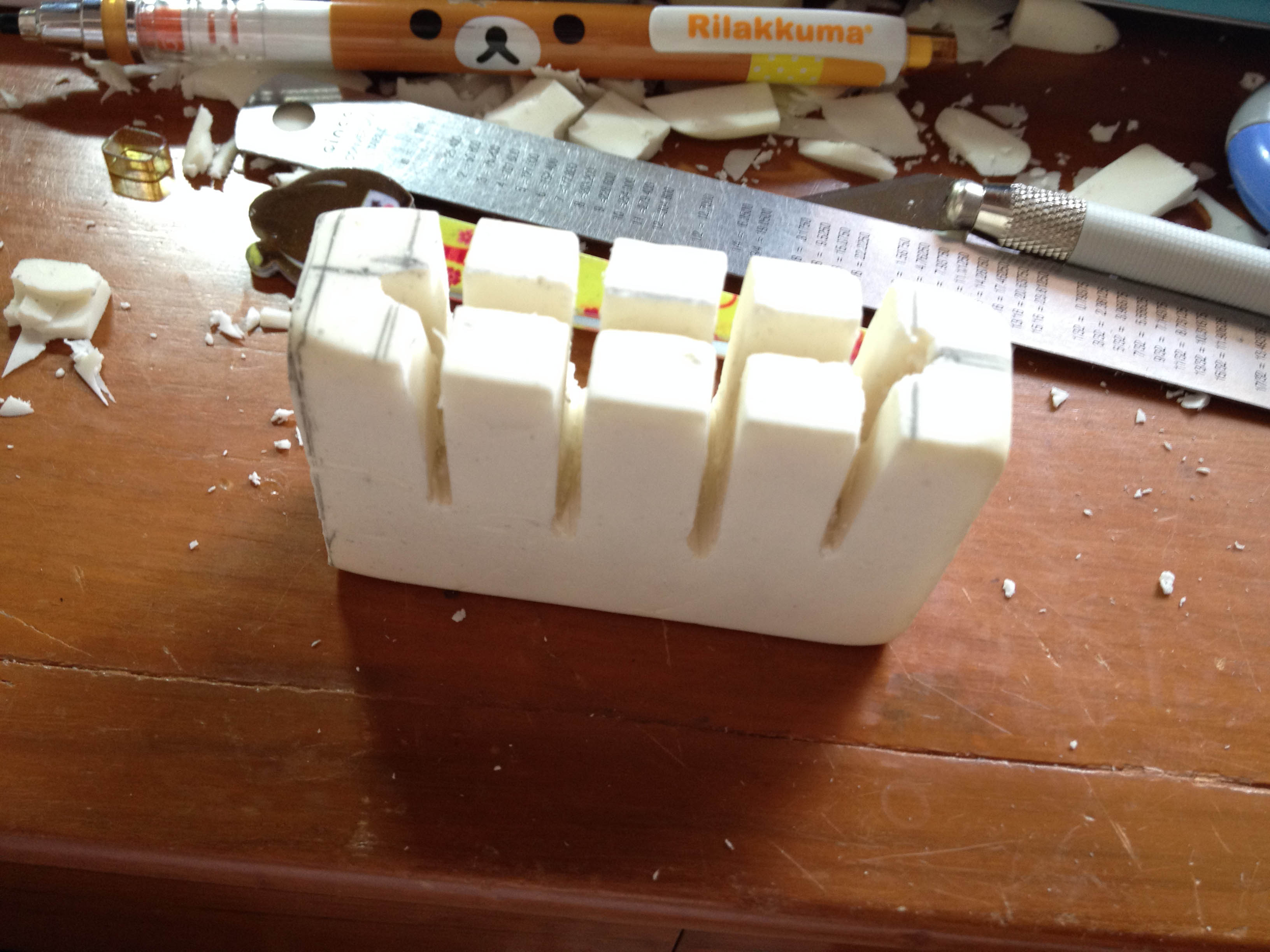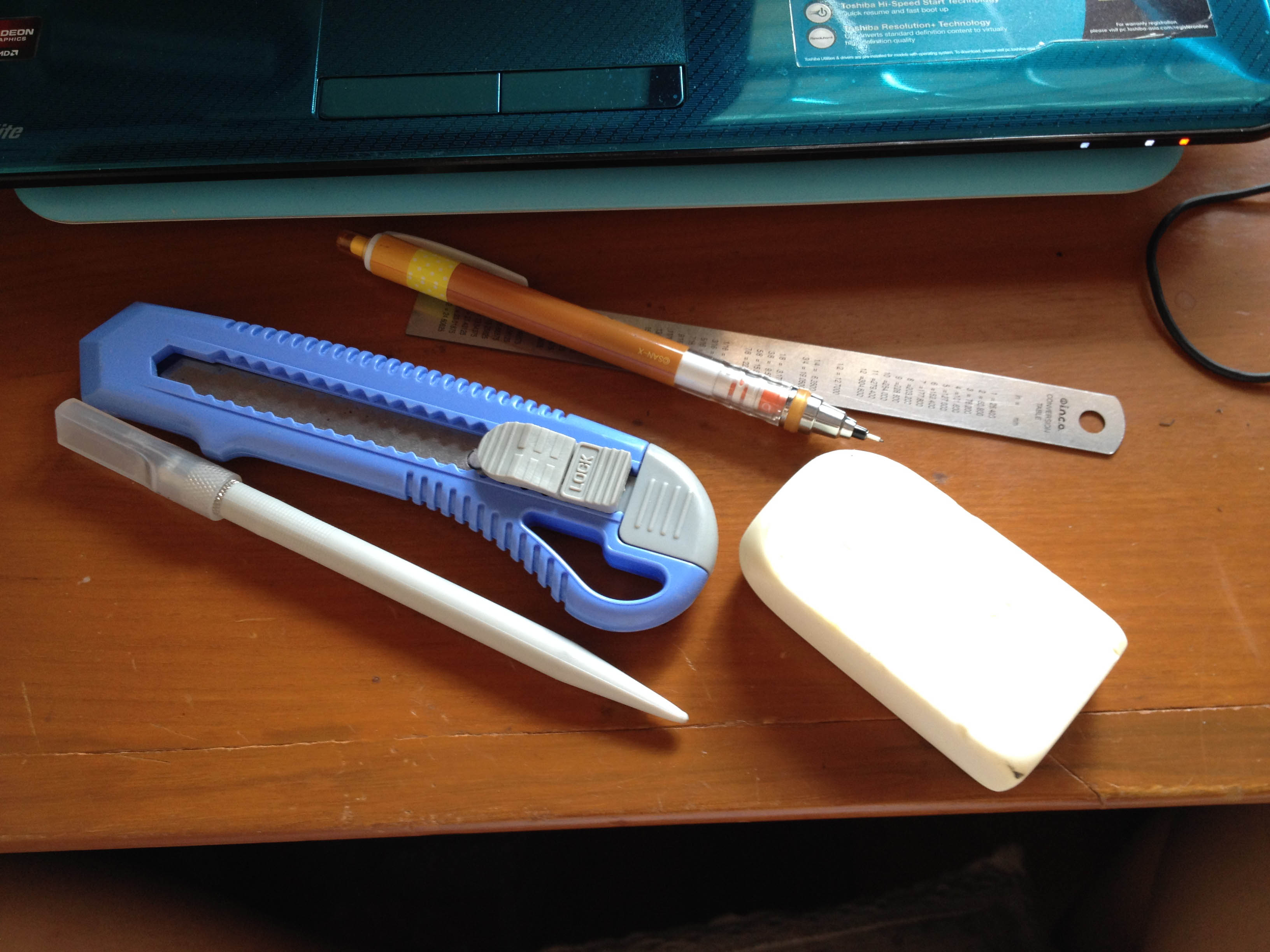นอกนั้นก็คัตเตอร์ใบมีดใหญ่ คัตเตอร์แกะสลัก ดินสอ ไม้บรรทัด(เอาไววัดและเอาไว้ไถๆเนื้อยางลบ)