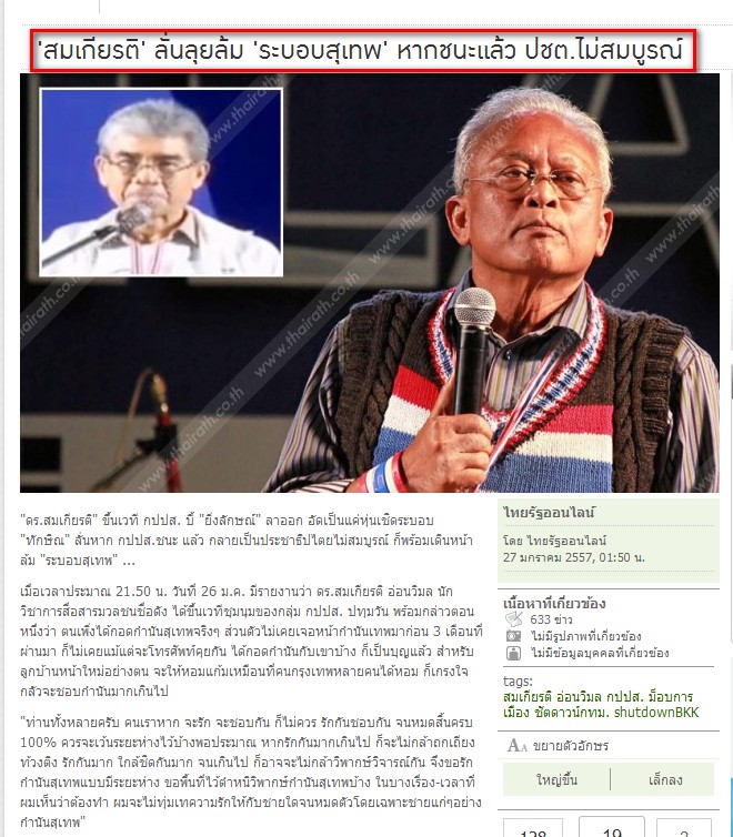 "สมเกียรติ"ลั่นลุยล้ม"ระบอบสุเทพ"หากชนะแล้ว ปชต.ไม่สมบูรณ์...ไหมล่ะ ก็แค่เอาระบอบสุเทพมาไล่ระบอบทักษิณ แล้วดีกว่ายังไง