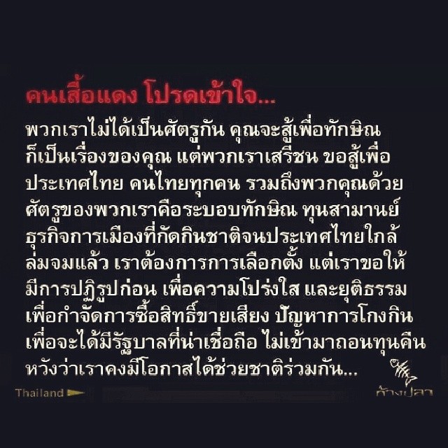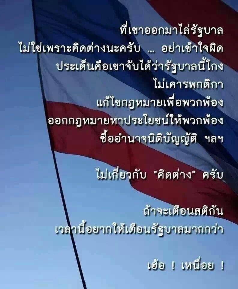 ไปเจอมาในเฟชภาพบอกให้เสื้อแดงเห็นใจ และเข้าใจ กลุ่ม กปปส. แต่เข้าไปอ่านแต่คอมเม้นท์ มันตรงกันข้าม คุณเอาการด่าทอเป็นการทำความเข้าใจเหรอ ผมกลับมองว่าพวกคุณ ควายดี ๆ นี้เองที่ไม่เข้าใจภาพที่เค้าสือ เอาแต่ความสะใจ คนที่เป็นเสื้อแดงของคุณก็คือคนที่คิดต่างกับคุณเหรอ คนคิดเหมือนกับเสื้อแดงแต่เค้าไม่ได้คิดเหมือนทุกอย่างมันเหมือนกันบางเรื่อง โดยเฉพาะเรื่องที่กลุ่ม สนธิ ลิ้มทองกุลทำเอาไว้ มันมีกลุ่มหนึ่งที่ไม่เห็นด้วยเลย และยังมีส่วนร่วมในม๊อปครั้งนี้ ยิ่งทำให้เค้าไม่เห็นด้วยกับการกระทำที่เหมือนก่อน เพราะพวกคุณคิดว่าคุณทำได้ แต่ คนอีกกลุ่มทำไม่ได้ แต่ต้นแบบมันมาจากคุณ นั้นละจะทำอะไร สื่อสารอะไรขอให้มันตรงกับรูป บนข้อความหน่อย ด่าคนอื่นแต่ทำซะเอง