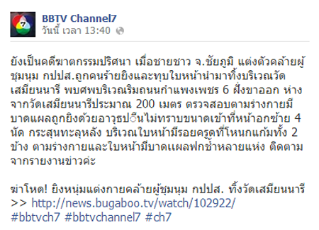 เอาอีกแล้วศพปริศนาที่แต่งตัวเหมือนผู้ชุมนุม กปปส. หน้าวัดเสมียนนารี ทราบชื่อคือนายบุญเที่ยง คำอิ่ม อายุ 41 ปี ที่ข้อเท้ามีเชื่อกรองเท้ามัดติดกันอยู่ และมีรอยบาดแผลทั่วร่ายกาย มีรอยกระสุนที่หน้าอกซ้าย 4 นัด ทะลุหลัง มีรอยครูดที่โหนกแก้มทั้ง 2 ข้าง แต่ยังไม่แน่ใจว่าเป็นผู้ที่มาชุมนุมด้วยหรือเปล่า เฮ้อ สยามเมืองยิ้มคงหายไปแล้วเหละเราว่า ต่อไปนี้จะใส้เสื้อสีแดง และคาดธงชาติ เดินออกจากบ้านได้มั้ยเนี้ย จะต้องฆ่ากันเองอีกกี่ศพคะ นี้อยากจะปิดสื่อทุกอย่างนะ แต่อดไม่ได้จริงๆอะ