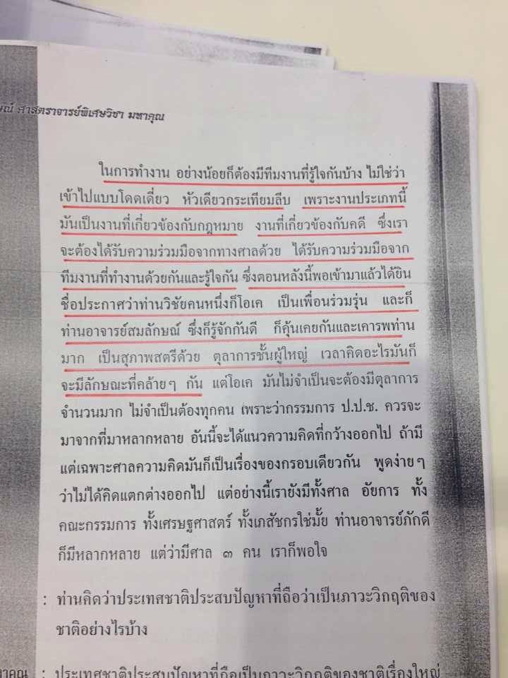 “...ในวันรุ่งขึ้นจากวันปฏิวัติ มีท่านผู้พิพากษาที่ไปช่วยงานในคณะ จะเรียกว่าช่วยงานรึเปล่า เรียกว่าเป็น คณะผู้พิพากษา ที่ว่าจะต้องเข้าไปชี้แจงข้อมูล ท่านโทรศัพท์มาหาผมว่า เขาจะทาบทามให้เป็น กรรมการ ป.ป.ช. จะเอามั้ย ผมก็ถามว่ามีใครบ้าง เขาก็บอกว่า มีการทาบทามท่านวสันต์ ท่านอุดม ผมก็บอกว่าดีสิ ถ้าเผื่อเป็นกลุ่มที่รู้ใจกันอยู่แล้ว
