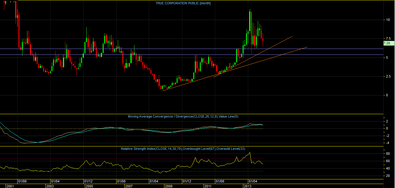 จาก tf month บอกถึงสภาวะว่าหุ้นทรูอยูระหว่างการปรับฐานใหญ่ กรอบขาขึ้นยังไม่ได้ถูกทำลายลงไป